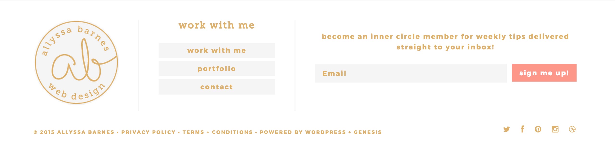 Depending on your blog’s content and your content marketing plan, some footer elements may benefit you more than others. For example, if you offer a mailing subscription for your readers, I would definitely recommend placing an opt-in in your footer! Likewise, if you create beautiful artwork, products, or anything visual and post about it on a social network, placing a widget for that social network in your footer would be beneficial. It’s all based on your needs! That said, try to avoid putting too much in your footer. It can easily take on a cluttered look, which isn’t what you want your readers to see after they’ve finished reading your amazing content!