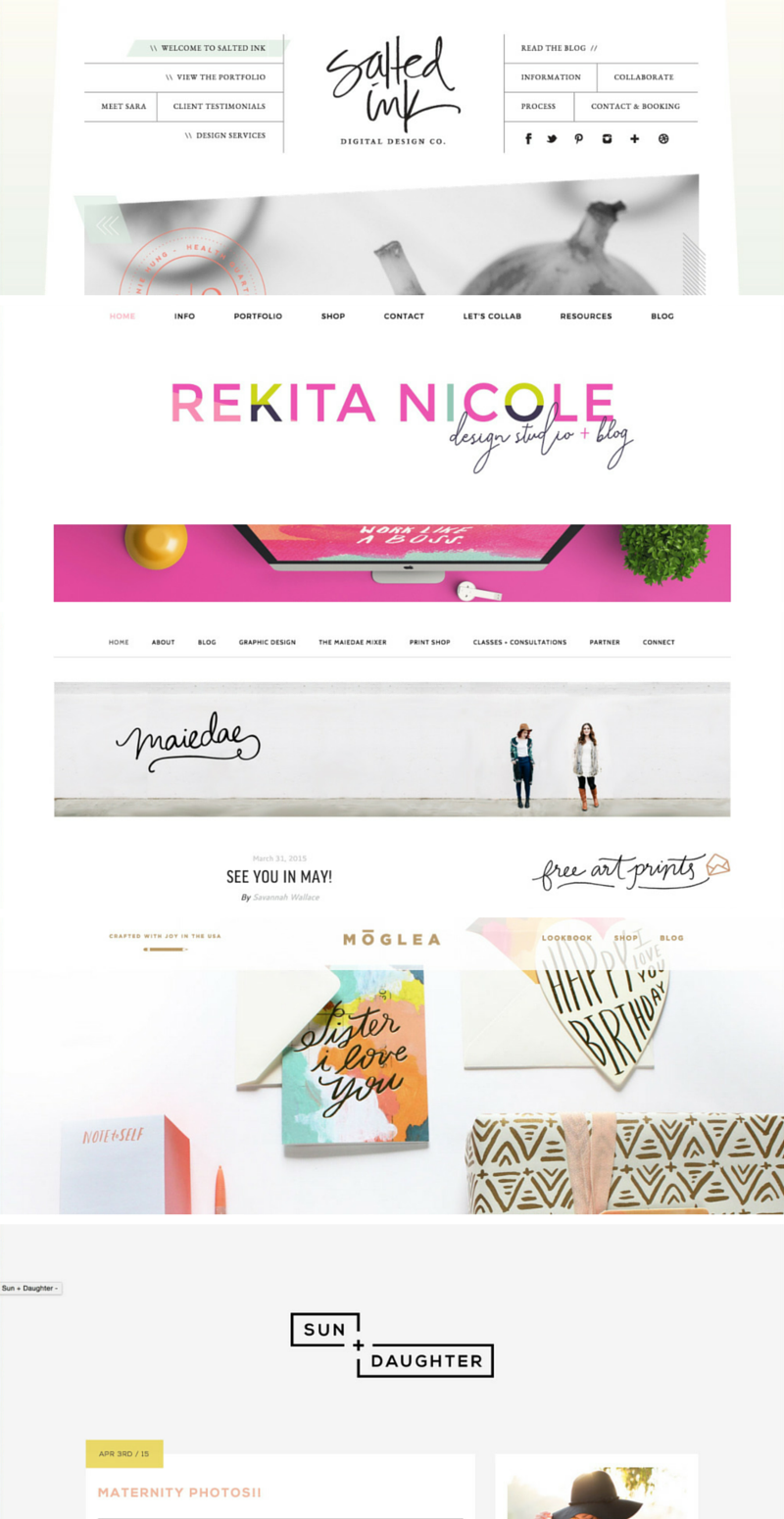 Beautiful Blog Designs No. 1 /beautiful-blog-designs-no-1/ /beautiful-blog-designs-no-1/#comments Sun, 12 Apr 2015 16:47:47 +0000 /?p=946 For those of you who don’t know, I’m kind of a blog design enthusiast. I love seeing how designers make such beautiful creations out of pixels, it’s like an art form in itself! I’ve been tapping into the design world recently with hopes of selling pre-made templates soon (eep!), and whenever I’m feeling uninspired, I start blog hopping in search of new ideas and beautiful blogs. I thought I’d share some of my recent favorites with y’all, because I have to imagine most bloggers out there love seeing great designs as much as I do! These are the blogs/shops from the graphic above: Salted Ink I love the relaxing vibe of this website. It has one of my favorite logo designs, and the same handwriting is used throughout the website’s graphics. The slanted look of the main content area is something I haven’t seen before, and it looks so great! Rekita Nicole The color palette on this website is just gorgeous! There’s enough white space that the colors aren’t too in-your-face, but it still gives off an energetic and fun vibe. And that logo is beautiful! Maiedae First of all, this is one of my favorite blog names. The letters just work so well together, and they form into a beautiful logo. The wide graphic below the navigation is another look I’m loving! If I had a blog partner, that would definitely be a must-have. Moglea Another interesting blog name! I love how the front page has almost no text—just images. It’s a great interactive look, and their beautiful products get all of the attention! Sun And Daughter This blog has such a simple design, but I can’t get over how much I love the color combo! The logo follows this simplistic theme, and of course, it’s also one of my favorites. I think I just love everything?